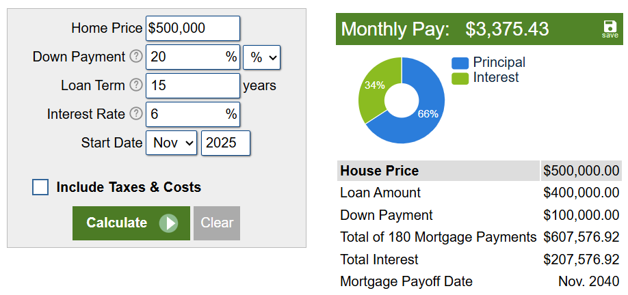$500K mortgage with 20% down-payment, 15 years. Source: Mortgage calculator
