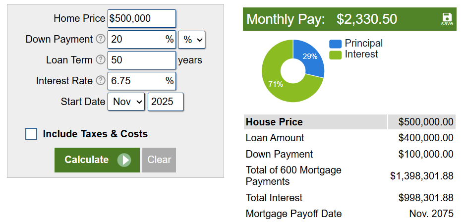 $500K mortgage with 20% down-payment, 50 years. Source: Mortgage calculator