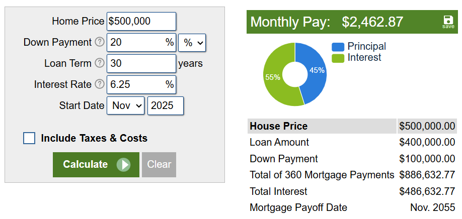 $500K mortgage with 20% down-payment, 30 years. Source: Mortgage calculator