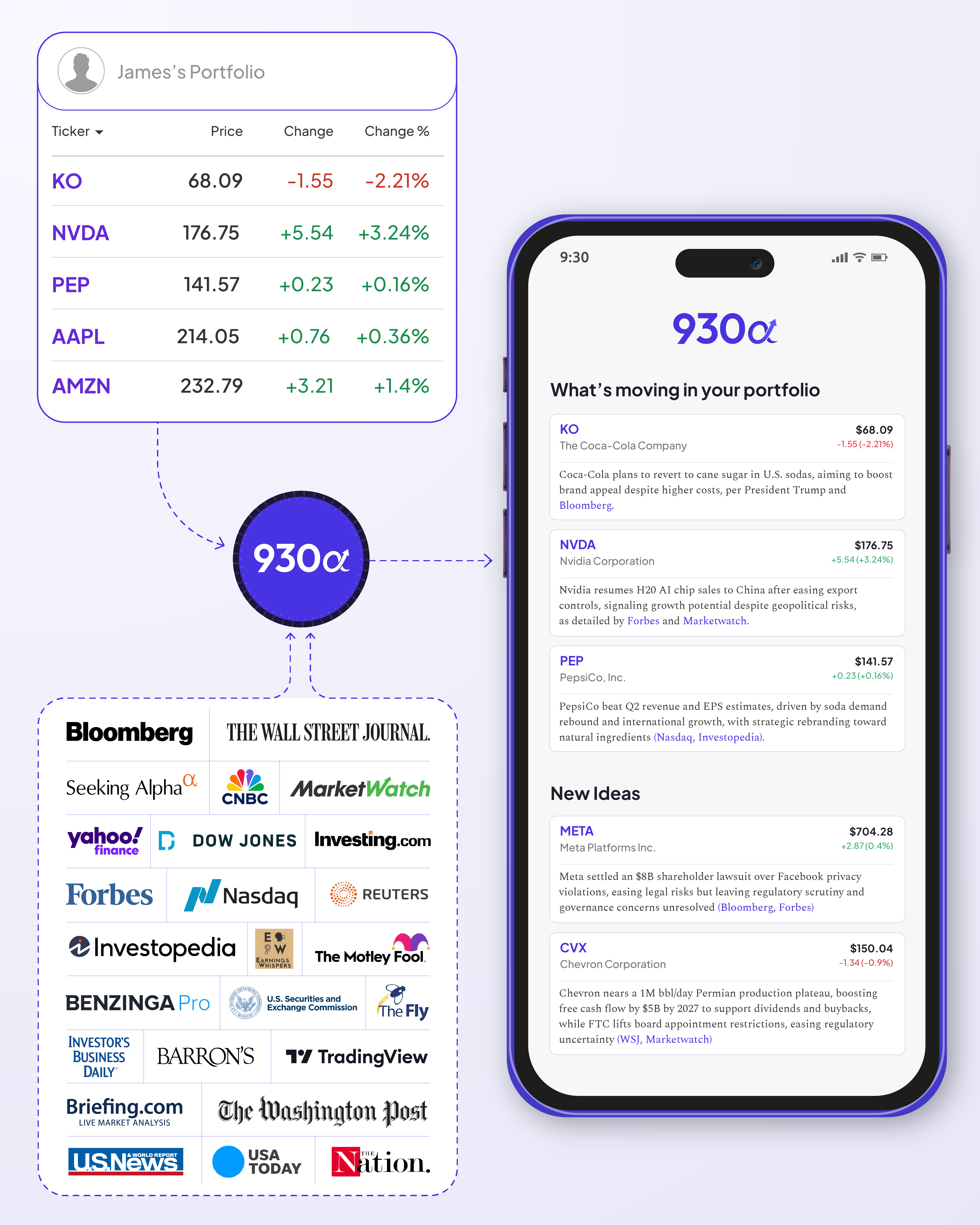 We are now tracking hundreds of news sources 24/7. Provide us with your main positions, and 930Alpha will deliver a custom, 3-minute briefing tailored to your portfolio every day before market open.