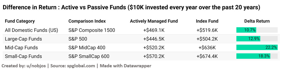 This should be the final nail in the coffin for actively managed funds as in all the scenarios of our analysis, just investing in a passive index provided significantly better return over the long run.