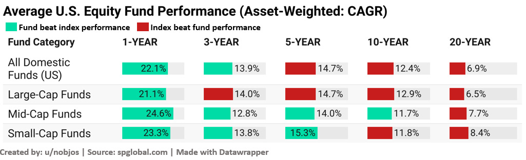 [1] The data provided by SPIVA is accounted for survivorship bias, compares similar funds to its benchmark rather than comparing all types to SP500, and has also split its returns into both asset and equal-weighted methods. A detailed explanation for each is given in their official scorecard.