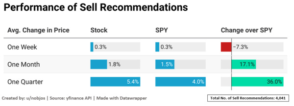Sell recommendations given by analysts definitely have a short-term impact on the stock price. As we can see from the chart, the one-week performance of stocks that were recommended as a sell was lower than that of the benchmark. But this trend does not hold over the long term with stocks having sell recommendations significantly outperforming the market over the time period of more than one month. Another thing to note here is that on average even after the sell recommendation, the stock price did not fall. (ie, the returns were not negative)