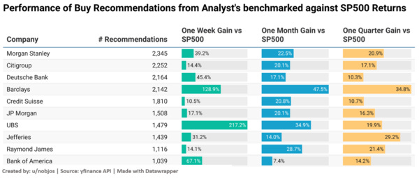 I analyzed the returns of the recommendations made by different banks. The most number of recommendations were made by Morgan Stanley with them making more than 2300 recommendations in the last 10 years. From the above chart, you can see that overall, the best returns were made by Barclays with their recommendations beating SP500 by more than 125% in one-week gains and more than 30% in quarterly gains.