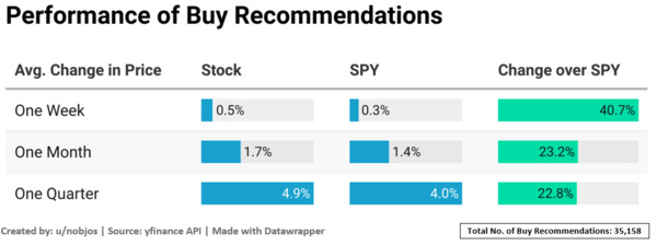 Out of the 35K buy recommendations made by the analysts, the average increase in stock price across the time periods were better than the SPY benchmark with one week returns bettering SPY by more than 40%. Adding to this, I also benchmarked the percentage of times analysts made the call and the stock price went up vs the SP500 index.