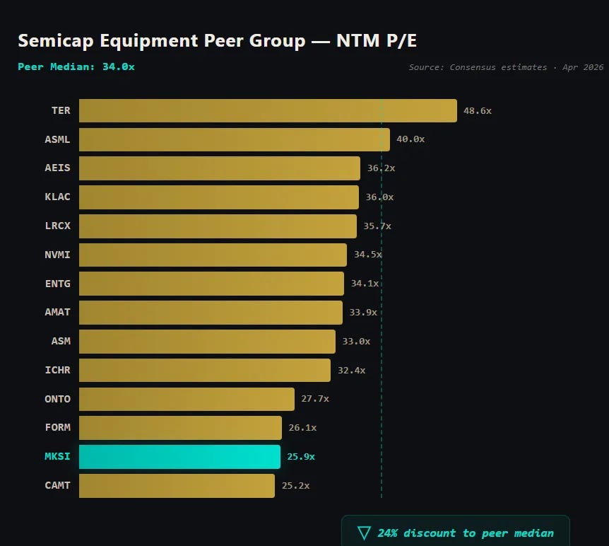 And yet, MKS trades at roughly 26x forward earnings, the cheapest forward P/E in the entire semiconductor equipment peer group (median forward multiple of ~34x).
