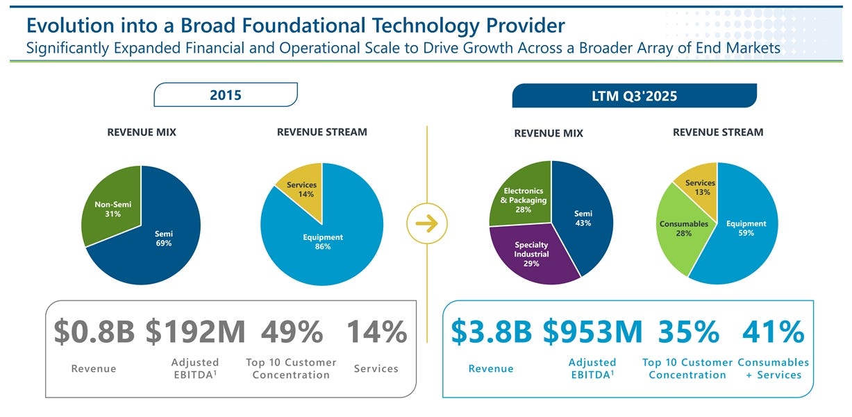 This is a fundamentally different business from MKS’s legacy semiconductor subsystem operation. Semiconductor subsystems are cyclical. When chipmakers cut capex, subsystem orders drop. But chemistry gets used up during production and needs to be constantly replenished. As long as the PCB factory is running, it needs chemistry. Management estimates that roughly 40% of MKS’s revenue now comes from consumables and services, chemistry that gets consumed in production and ongoing service contracts. This provides a layer of recurring revenue stability that the old MKS never had, which has also started to reflect in how markets are viewing the company.