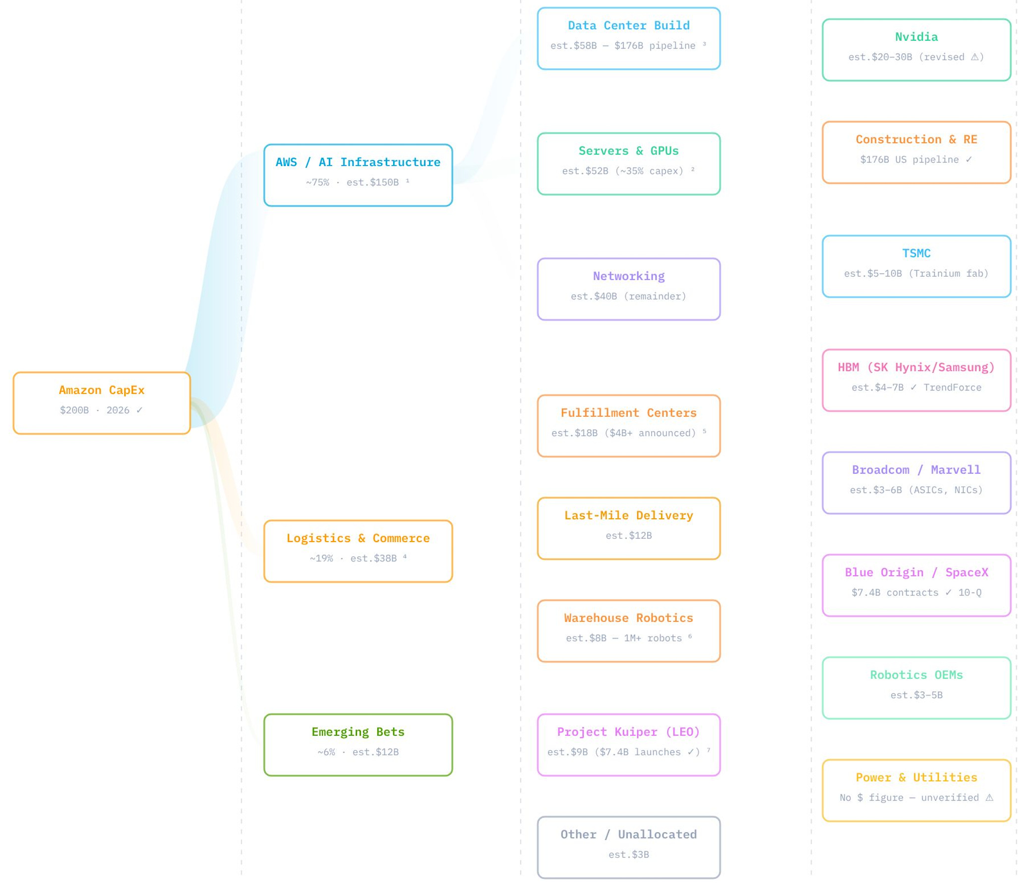 Usually, our approach at Market Sentiment for finding bottlenecks is going top-down — which simply means is we follow the capex trail to identify where the capital is flowing and which companies and industries stand to benefit. For example, here is a rough breakdown of Amazon will spend its $200B capex this year.