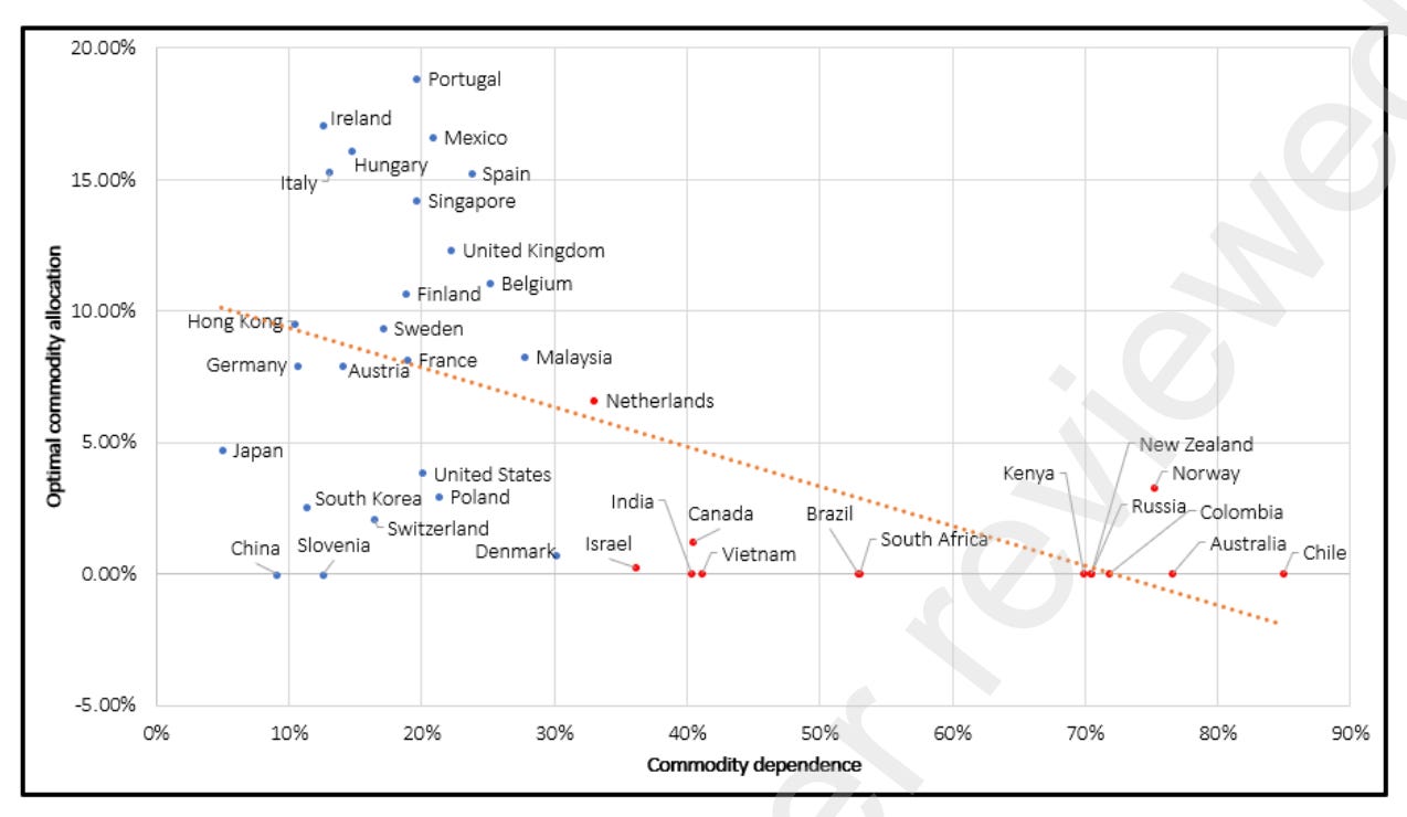 The study investigated the diversification benefits provided by commodities across 38 different markets. While commodities are usually considered to add diversification benefits to the portfolio6, the authors found that the diversification benefits depend on how much the investor country is dependent on commodities.