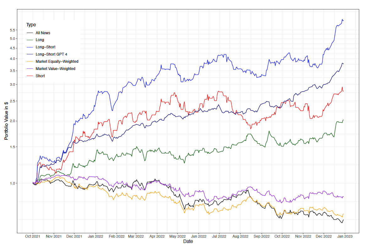 Ignoring the transaction costs, a long-short strategy on ChatGPT-3.5 returned 550% from 2021 Oct to 2022 Dec with both the long side delivering 200% and the short side delivering 250% (during the same period, the S&P 500 was down ~10%!)