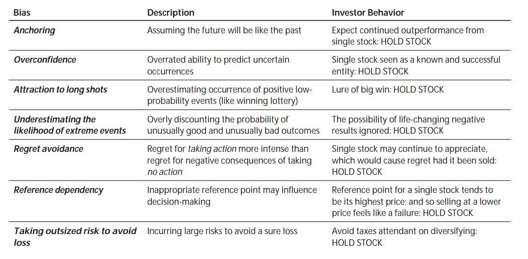 Certain behavioral biases such as anchoring, overconfidence, and regret avoidance push investors towards holding instead of selling an outsized position.
