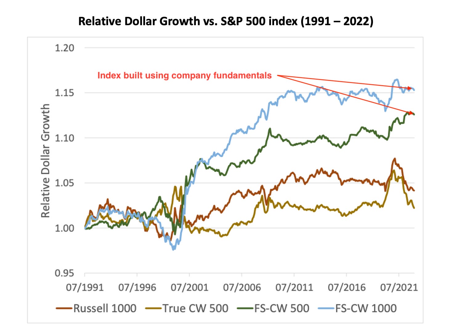 Over 30 years from 1991 to 2022, the indices built using fundamental measures outperformed traditional market-cap weighted indices. The higher returns were generated with a lower turnover in the portfolio (leading to lower transaction costs) and at a lower risk.