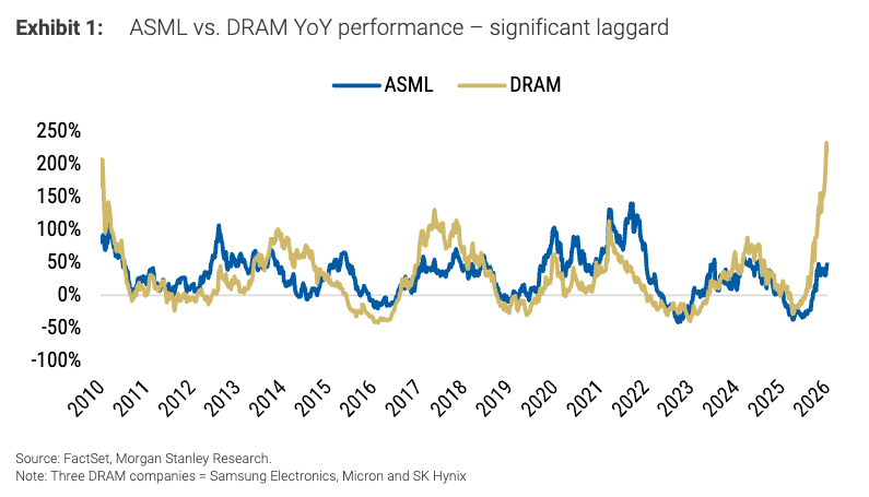 You can read our deep dive into ASML here (up 68% since our coverage). According to Morgan Stanley research, even though semiconductor companies experience an upturn in revenue and profitability one or two quarters ahead of the memory makers (as equipment orders are placed well in advance), there is a significant lag before their share prices catch up to those of the memory makers (we are looking to capitalize on this). If you are a value investor, you can check our valuation model for ASML 0.00%↑ here.