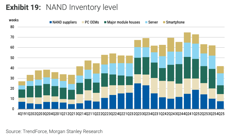 Declining inventory: Hyper-scalers are still stockpiling, and we see no line of sight on inventory bottoming. Until we do, demand is structurally outpacing supply.