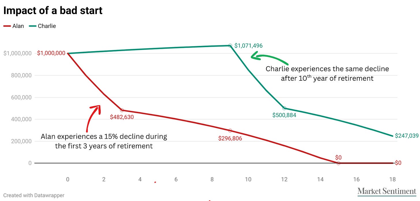 Consider the example of two retirees, Alan and Charlie. They both started with a $1M portfolio and took an initial withdrawal of $ 50K. They will then increase their withdrawal by 2% every year to account for inflation. Both of them get an annualized long-term return of 6% from their investments.