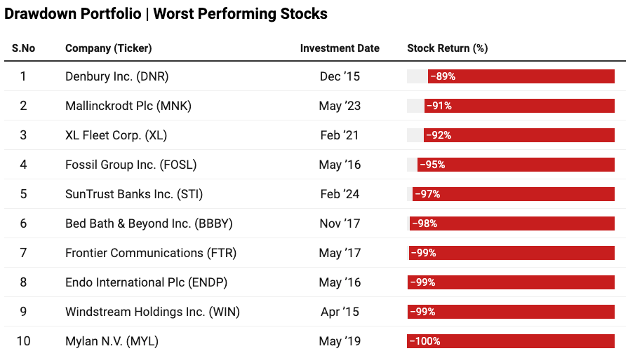 As we highlighted in our previous report, even the best investments have periods of massive drawdowns. Apple was down 83% at one point, and Home Depot was down 76%. These companies are the top 10 companies that generated the maximum shareholder returns in the past 4 decades!